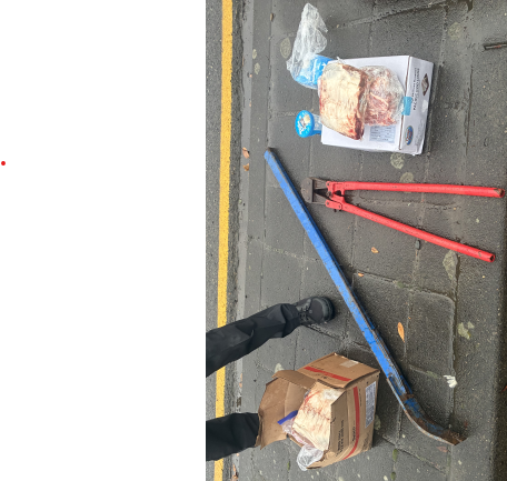 Burglar tools and some of the food items taken in the burglary, which were recovered in the suspects’ vehicle.