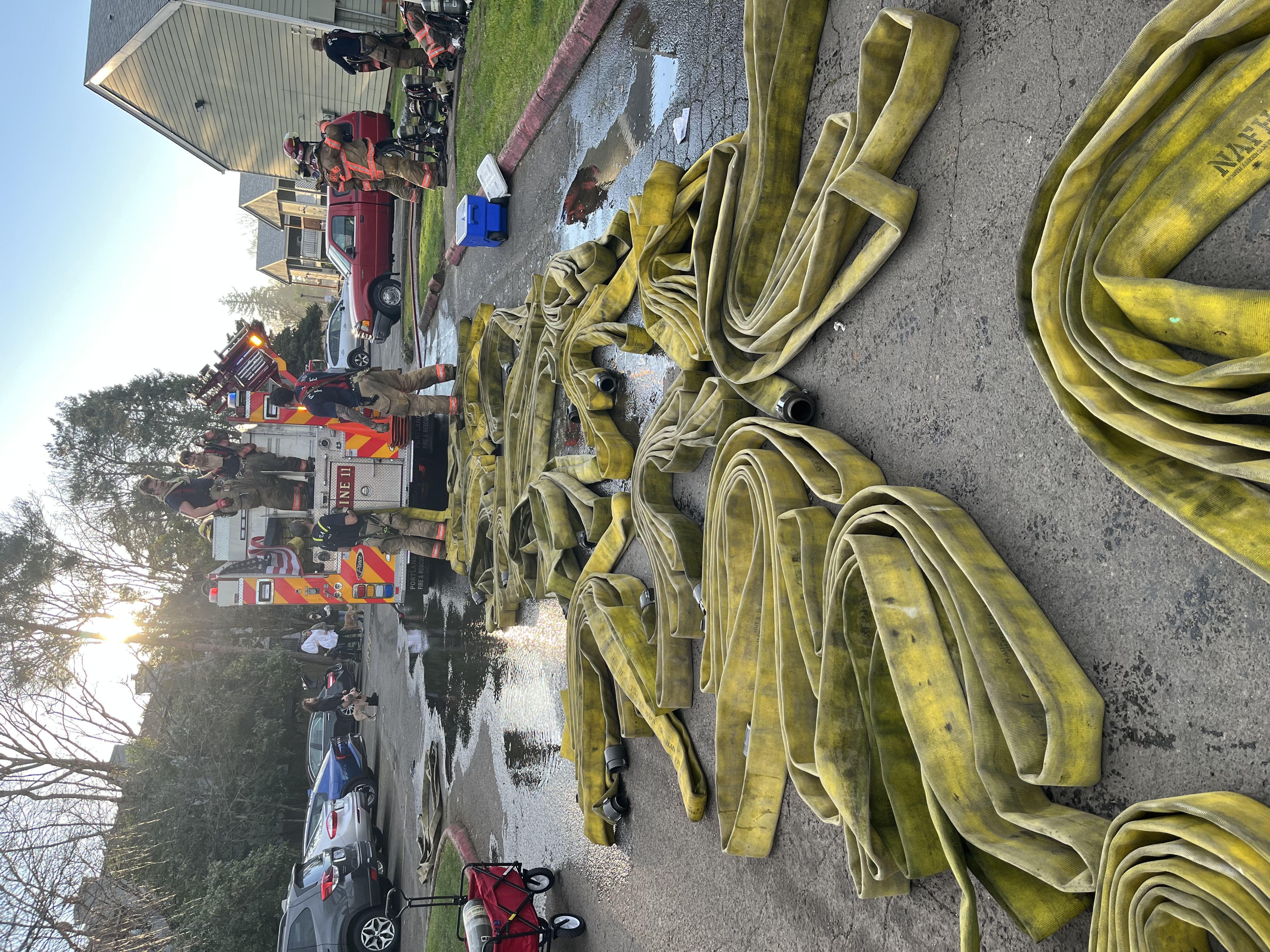 With the closest hydrant available on the onboard computer system being on SE 92 with significant fire present a “double header” was attached to the fire hydrant indicating the hydrant had 2 hoses attached to ensure enough water would be available if needed in the suppression efforts. The building with the fire issue was located near the back of a large property with many apartment buildings. The engine bed was completely empty with 1600’ of lay-in line on the ground.