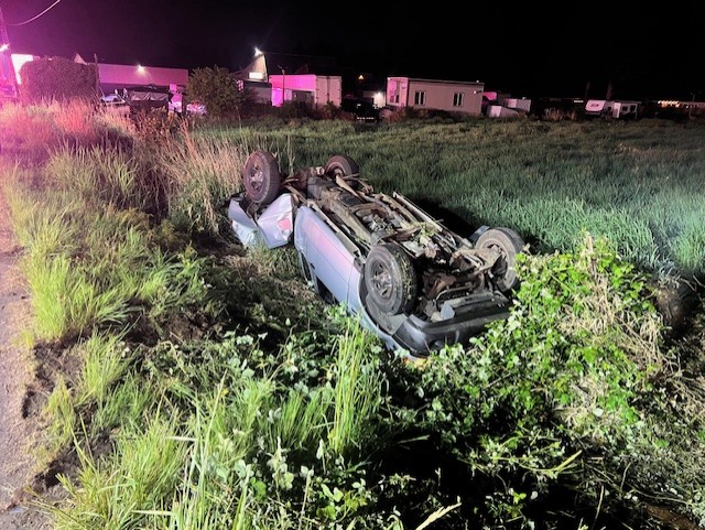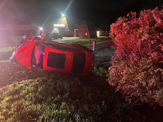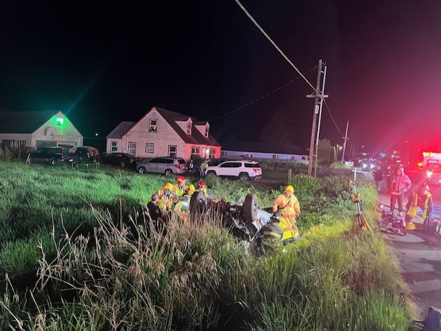 Longview, WA – Emergency crews responded to a two-vehicle rollover accident at 4013 Ocean Beach Hwy just before 2 am Thursday. Initial reports from bystanders were that one vehicle had rolled over and is resting on its top off of the roadway, and another is on its side. Law enforcement arrived at the scene and confirmed two male subjects were trapped inside the upside-down passenger truck and the occupants of the other vehicle had removed themselves from the passenger car, which was resting on its side.