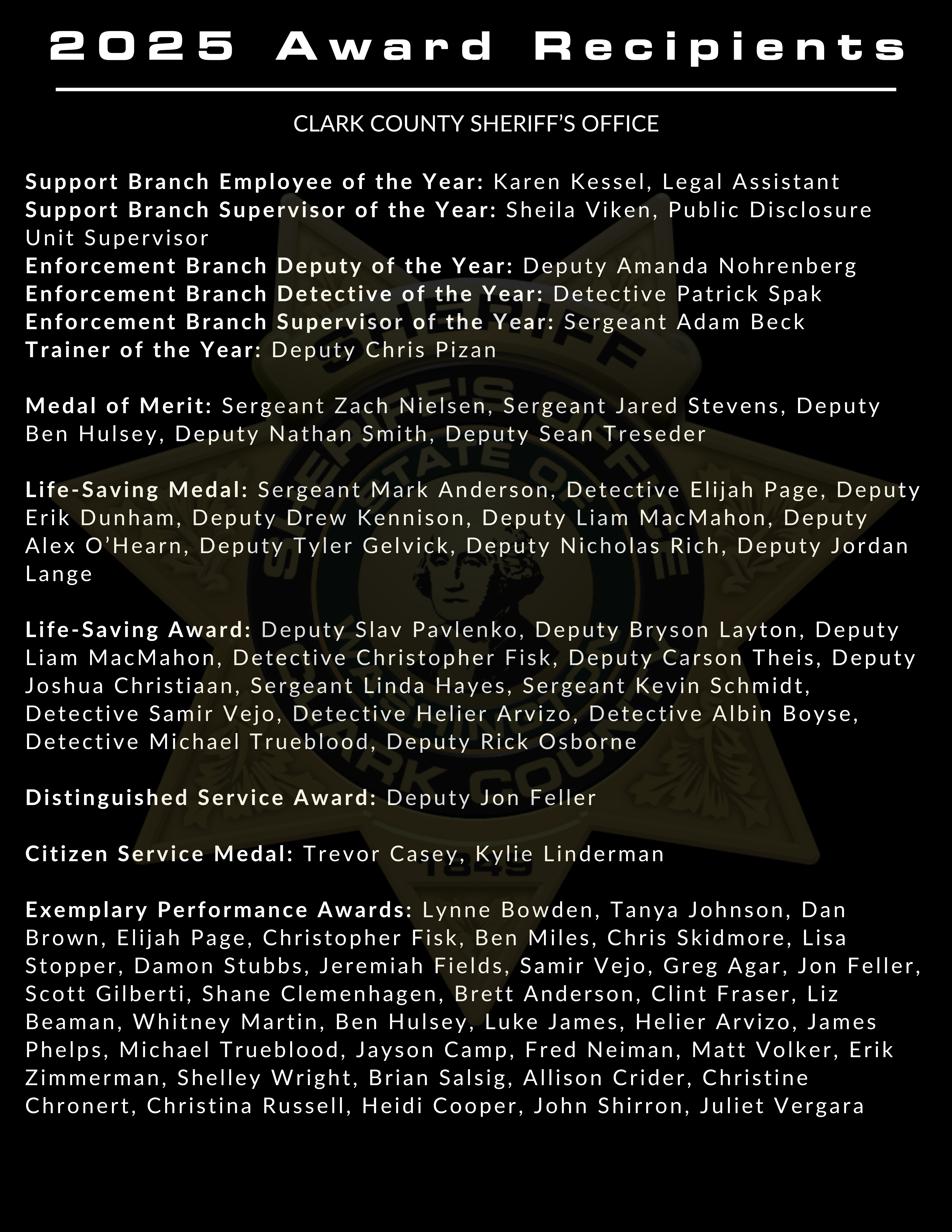 “We are proud to recognize the deputies, non-sworn professional staff, and citizens whose actions made a meaningful difference in our community,” said Sheriff John Horch. “Each person honored demonstrated courage, dedication, and a willingness to step up when it mattered most. I’m grateful for their service and proud of the example they set for Clark County.”