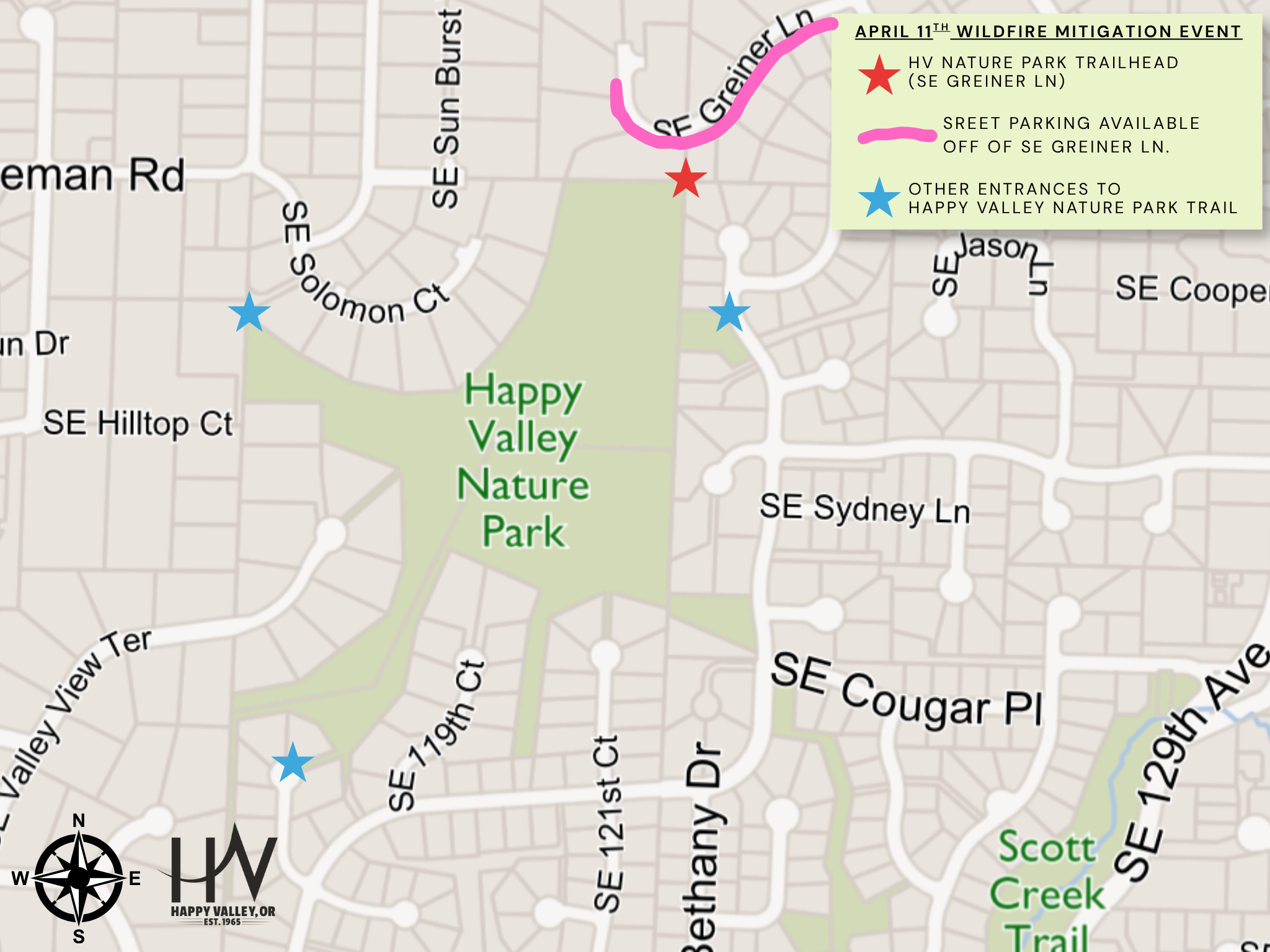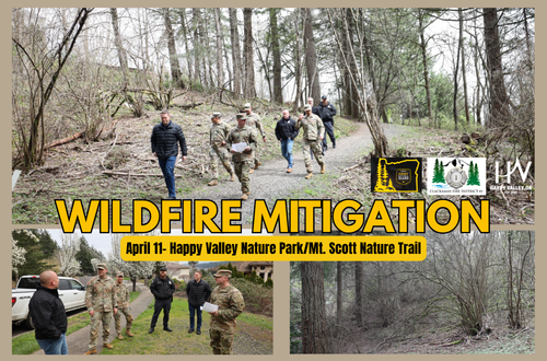 Today, the City of Happy Valley, in partnership with the Oregon National Guard, Clackamas Fire, National Charity League, Boys Team Charity, and dedicated community volunteers, are actively working at Happy Valley Nature Park/Mt. Scott Nature Trail to reduce wildfire risk ahead of the summer season.