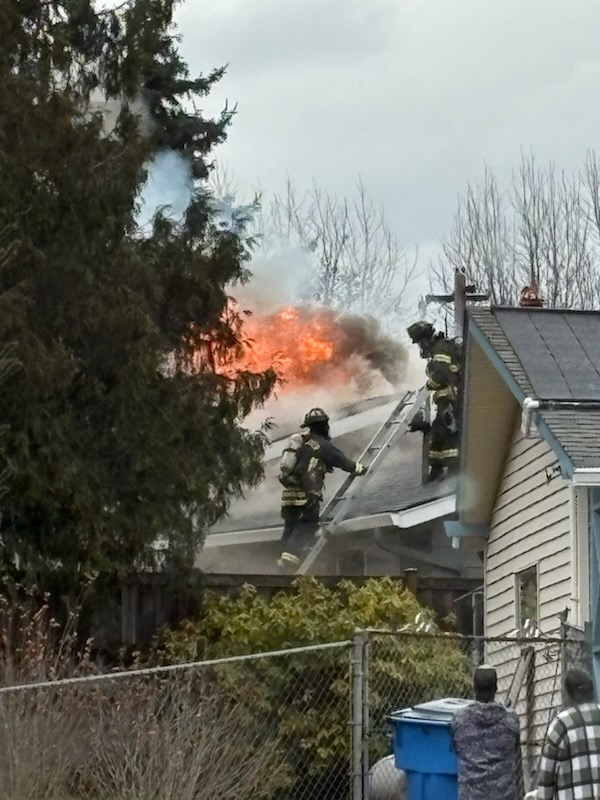 Just after 4:00 PM this evening the Vancouver Fire Department was dispatched to reports of a house fire at 3000 NE 45th street in Vancouver. First arriving crews found a single story house with a large volume of fire and smoke coming from the back of the house. The fire appeared to have spread to the attic so firefighters went inside of the house with a hoseline to extinguish the fire. More firefighters climbed up a ladder to cut holes in the roof using chainsaws to ventilate the hose and let the hot smoke and gases out through the roof. It took 25 minutes to get the fire under control. An electrical line on the side of the house fell to the ground causing a brief safety concern but Clark PUD arrived swiftly to turn off the power to the home. 3 occupants and a pet were able to escape safely without injury and denied the assistance of red cross. In total, 22 firefighters were on scene. Firefighters are still on scene performing overhaul and ensuring that all hot spots are fully extinguished. No other injuries were reported. The cause of the fire is under investigation by the Vancouver Fire Marshal's Office.