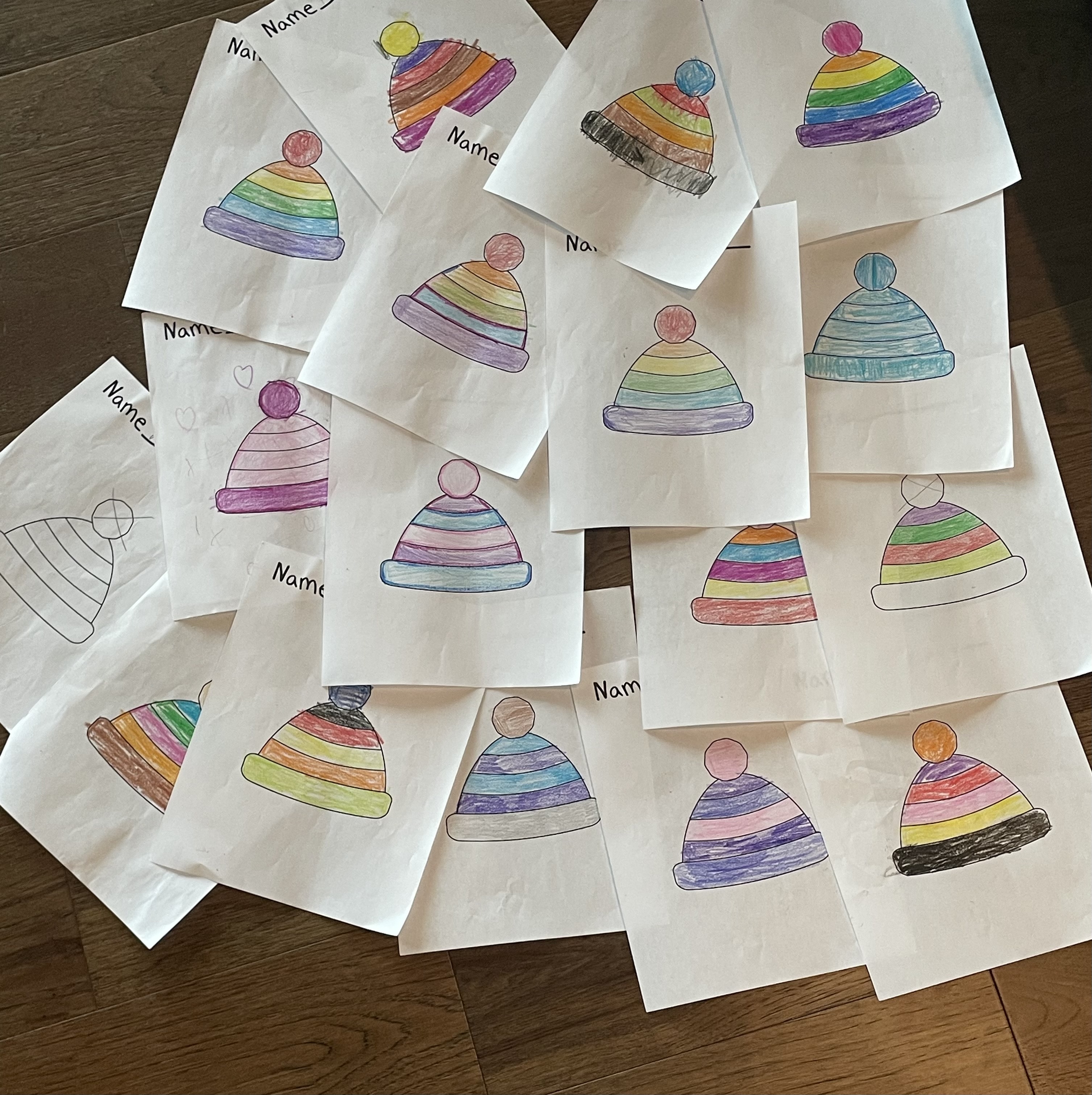 Before winter break in December, Wallace Elementary first-grade teacher Ashley Lowry gave her students an unusual assignment: design their “perfect hat” using a simple paper template and crayons. The students colored bold patterns with their favorite colors, never knowing why they were doing it.