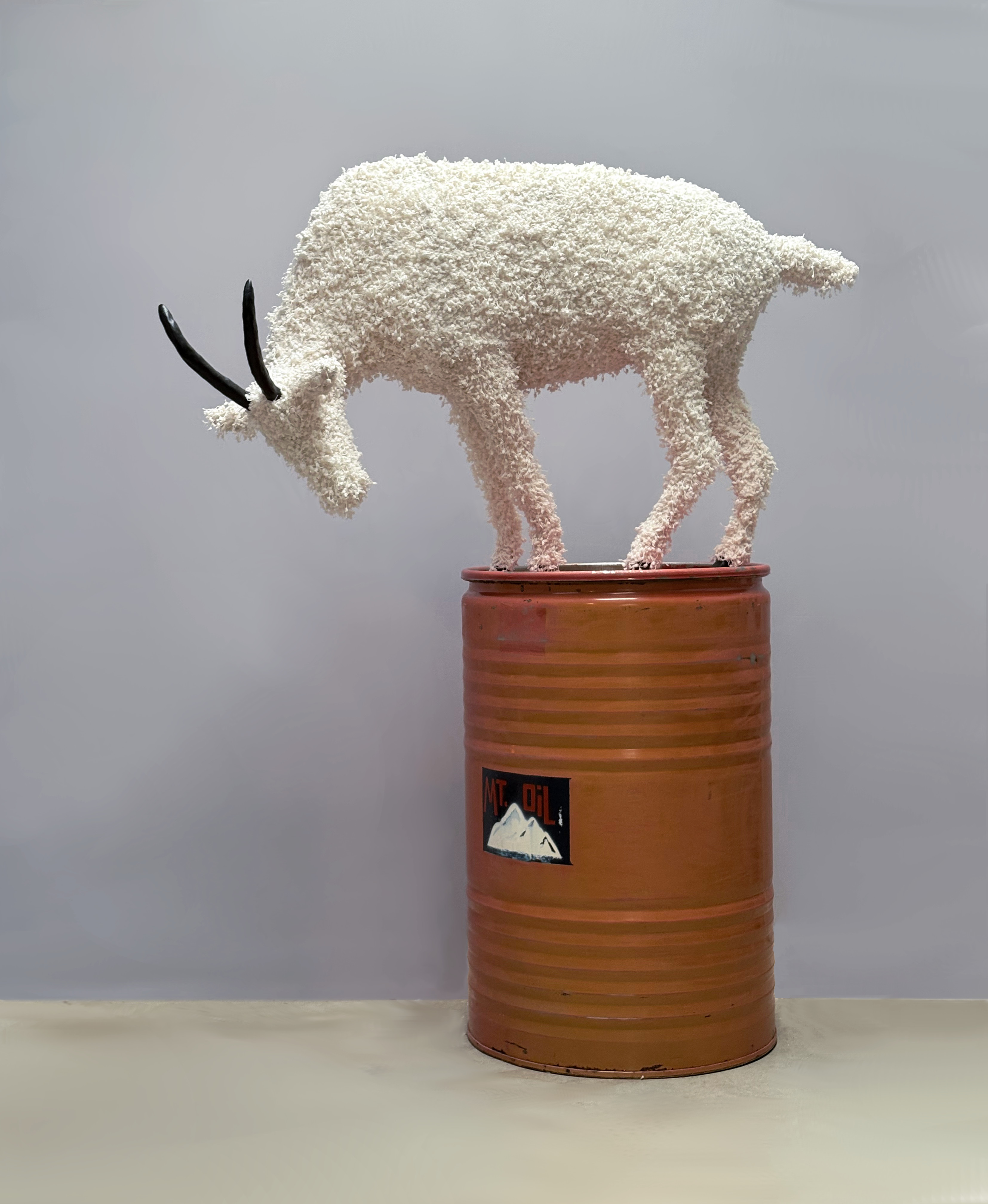“The Edge of the World” explores society’s desire to control the natural world by using mixed media sculptural installations of animals created through found and repurposed materials. Automotive objects, wire, computer cables and other castoffs are coupled with textile materials to bring creatures to life and offer viewers an opportunity to reflect on human consumption.