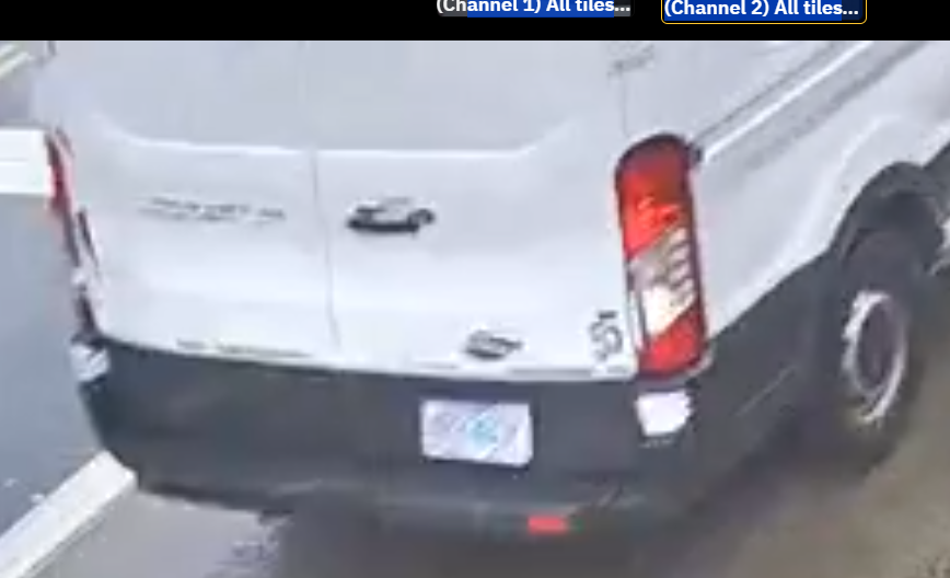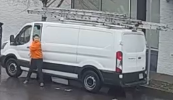 The suspect driver is described as a Hispanic male, 5’5”-5’7”, 150 lbs., possibly having a face tattoo. The suspect vehicle is a white, possibly Ford van with Oregon plates. A nearby surveillance camera captured an image of the suspect vehicle.