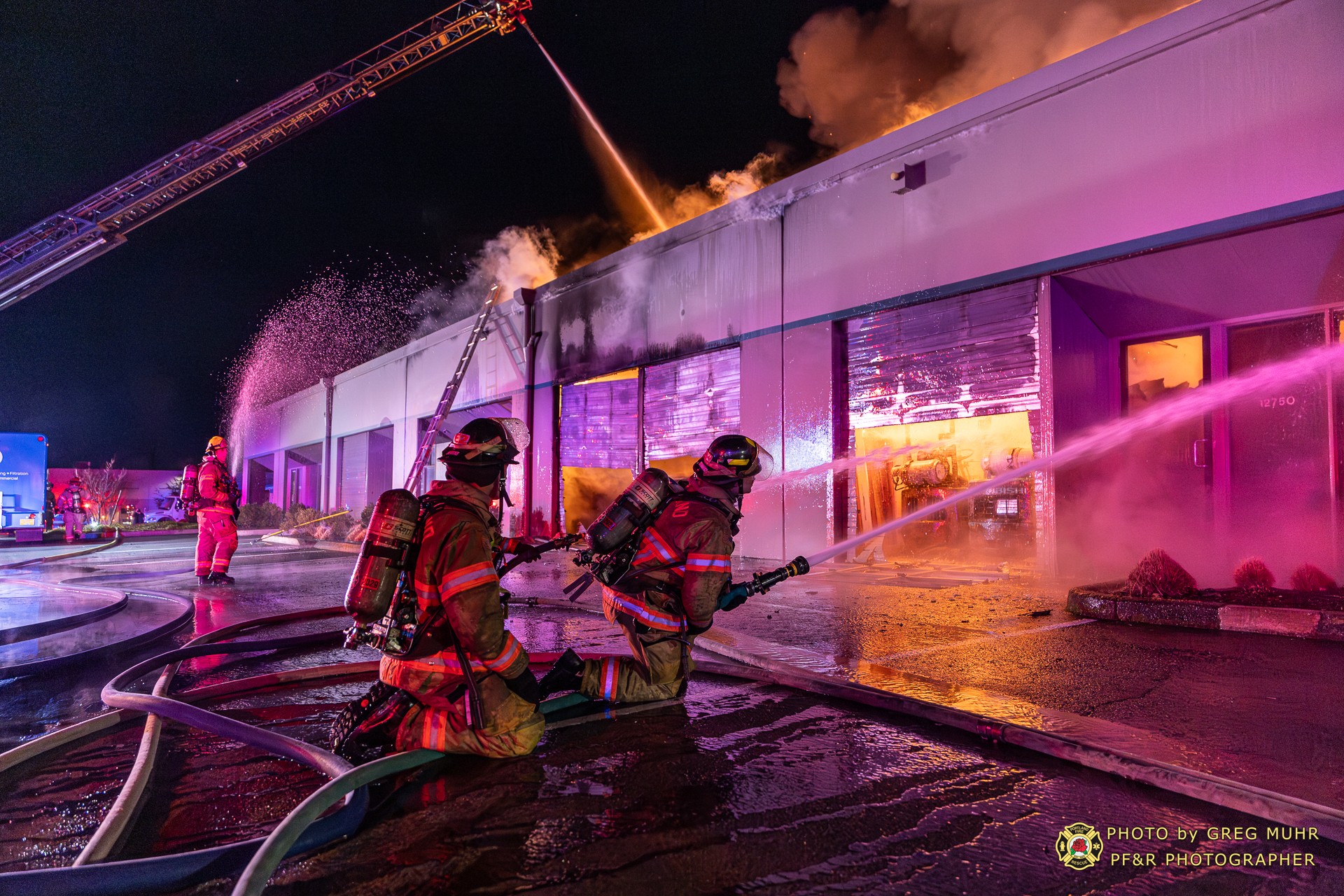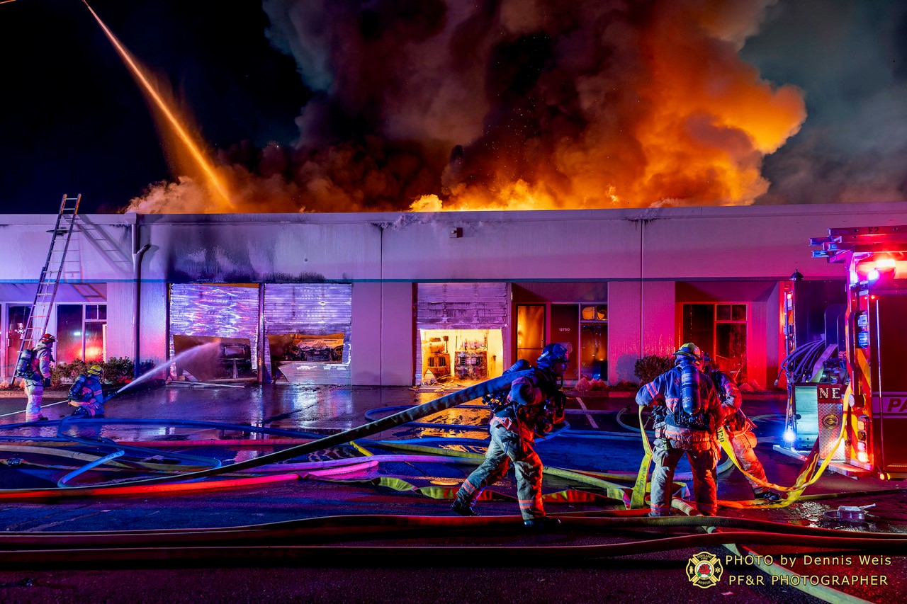 It was quickly determined that this concrete tilt-up style warehouse contained several businesses, but they all were closed and no employees were on-site, so a defensive fire attack was initiated. Elevated master streams were set up to attack the fire from above as sections of the roof had burned through. Additionally, large hose lines were deployed to attack the fire through openings along the sides of the building, including several bay doors that had been forced open by firefighters.