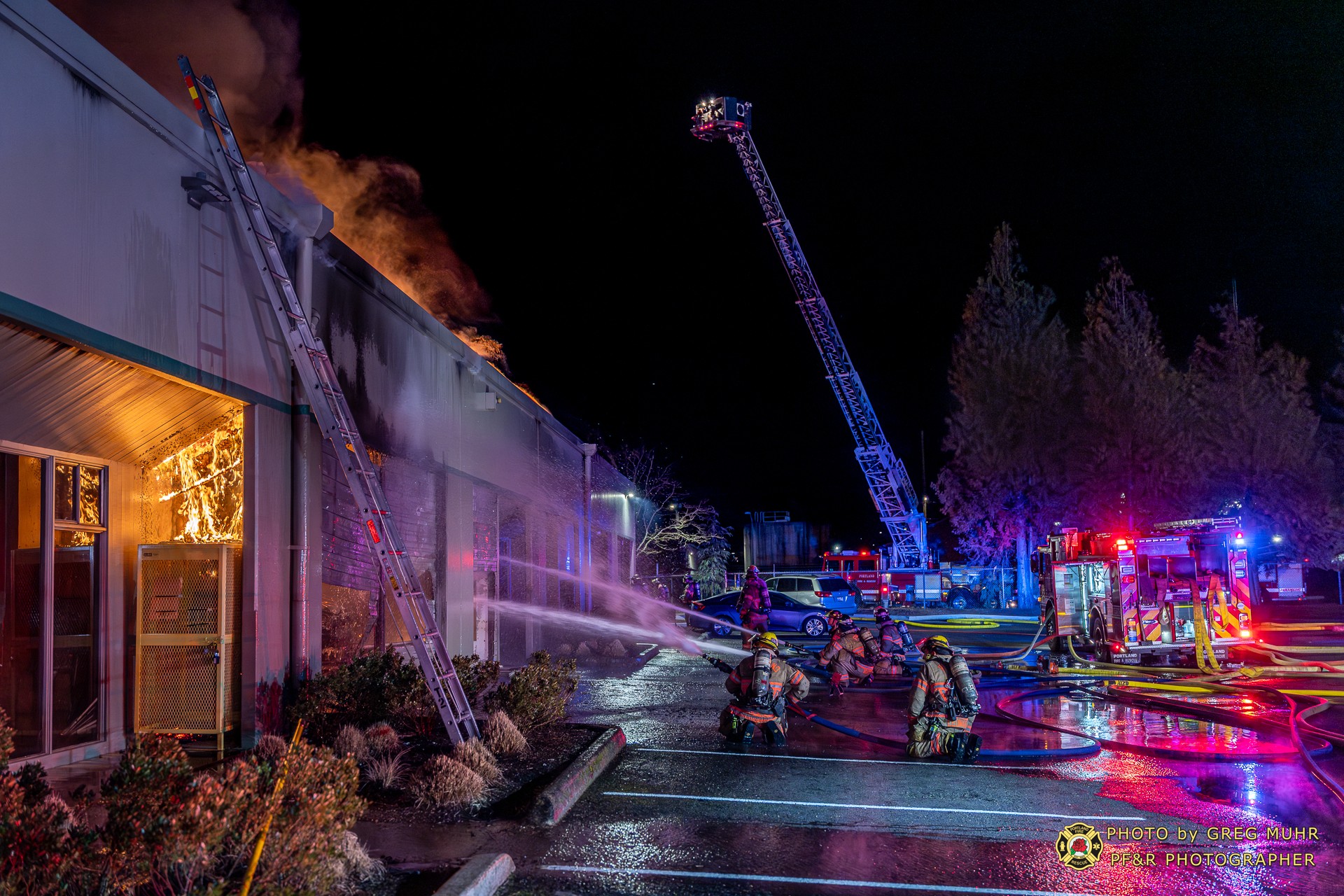 This morning at about 5:30am Portland Fire was called to a commercial fire in the vicinity of NE 127th and Marx St. The initial caller reported seeing smoke from a building west of them but were unable to give an exact address. While enroute to the call the first arriving company noted a “header” or a large column of smoke coming from the roof and upon arrival it was noted heavy smoke coming from several bay doors of the building as well as the roof.