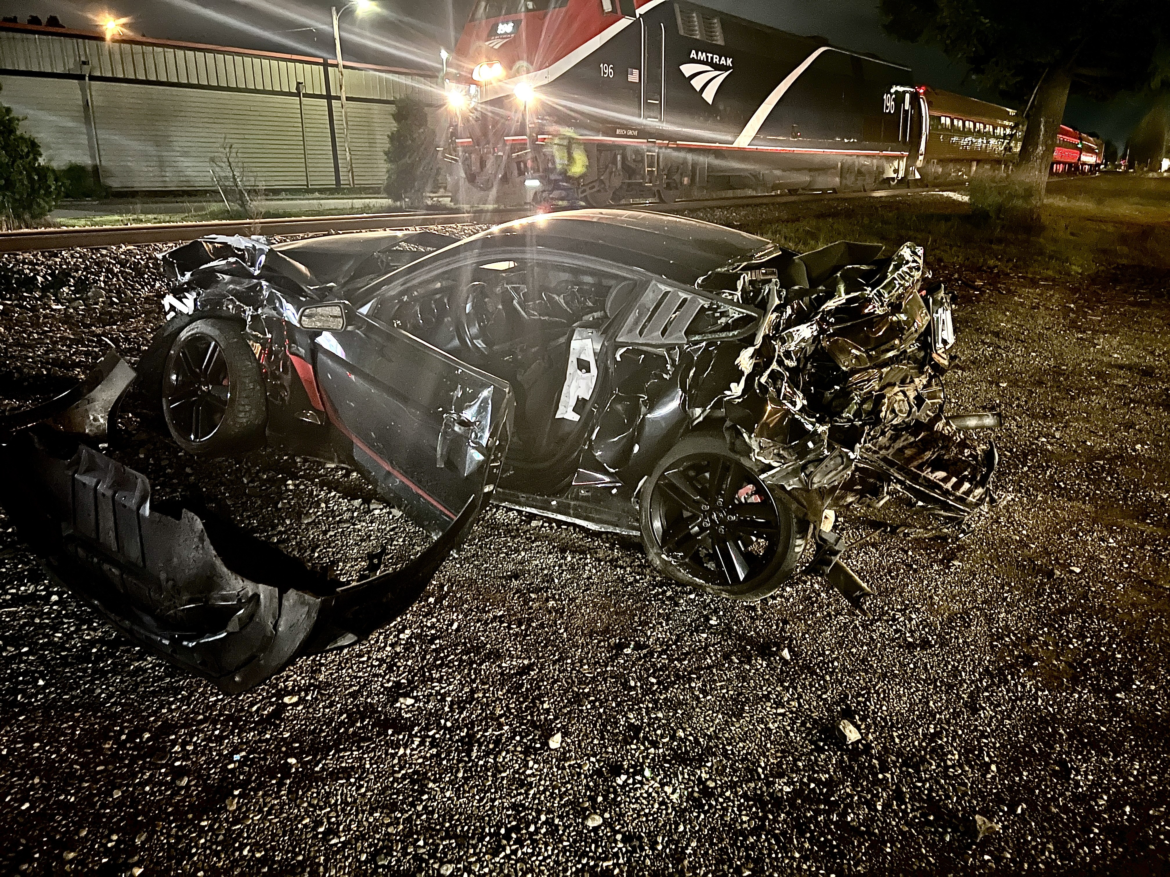 Officers arrived, locating a black Ford Mustang coupe which had been struck by an Amtrack train. After being struck, the Mustang coupe was pushed off the tracks crashing into a vehicle parked in a nearby lot. The Amtrack train was able to stop a short distance away.