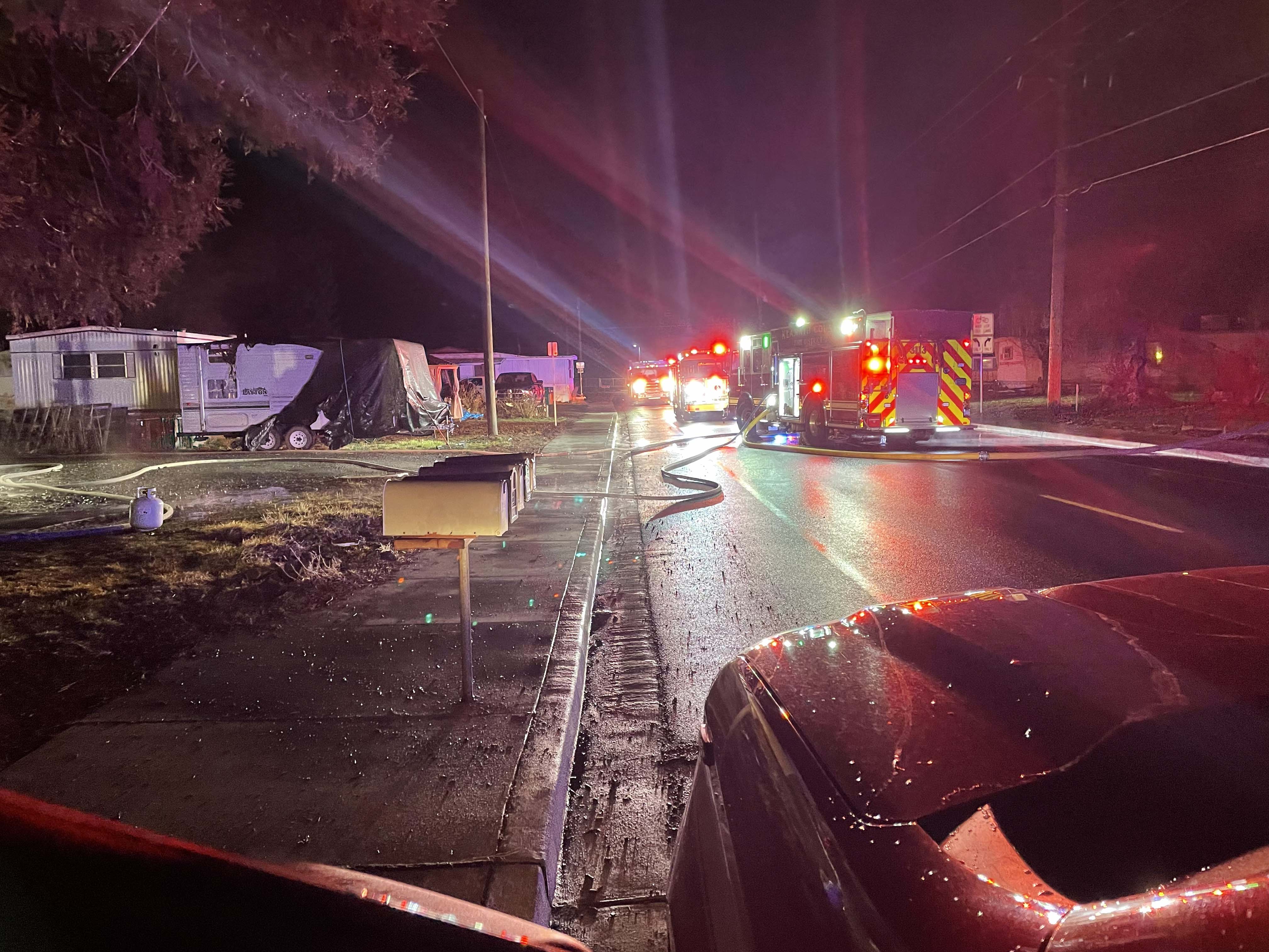 Multiple 911 callers reported a trailer fully involved with flames visible from the windows. The first arriving KCFD1 engine company observed fire extending from several windows and through the roof of the single-wide trailer. Crews initiated an immediate and aggressive fire attack, successfully knocking down the bulk of the fire and preventing further spread.