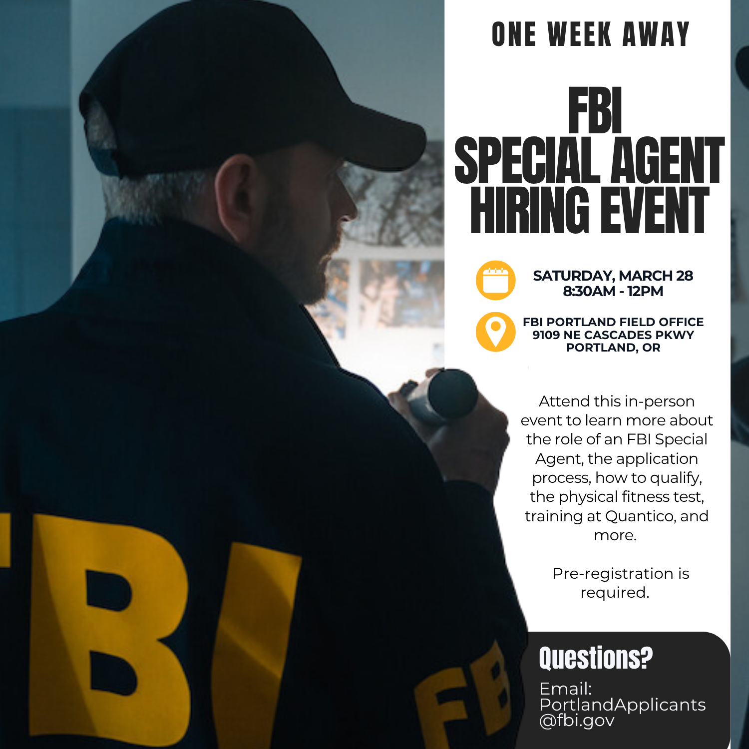 The FBI will host a Special Agent hiring event on Saturday, March 28, 2026 from 8:30am - 12pm at FBI Portland HQ 9109 NE Cascades Pkwy