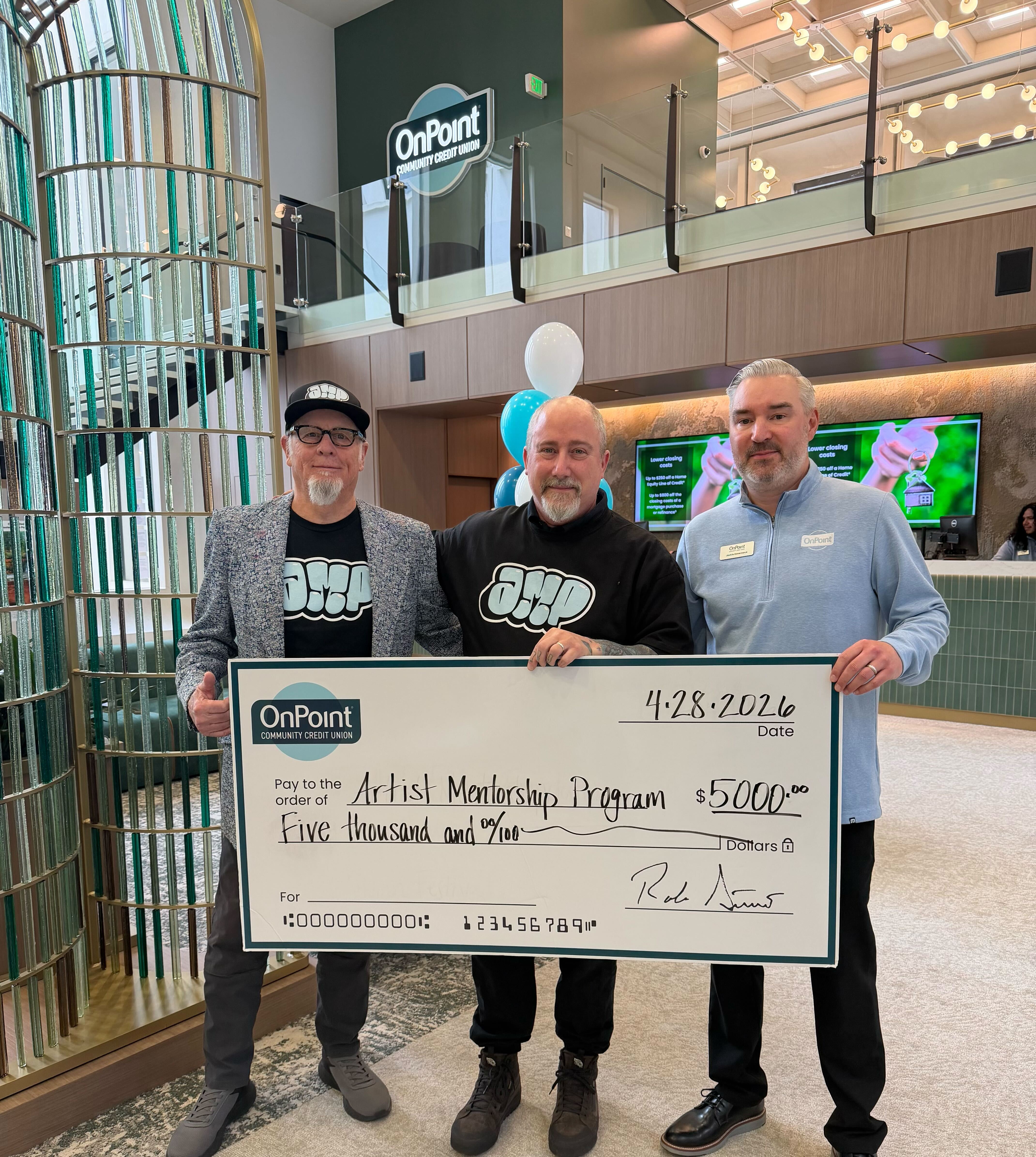 As part of the grand opening, OnPoint presented a $5,000 donation to the Artist Mentorship Program (AMP), a Portland-based nonprofit that provides creative and professional development opportunities for local artists. OnPoint also provided refreshments and giveaways to members and visitors throughout the day.