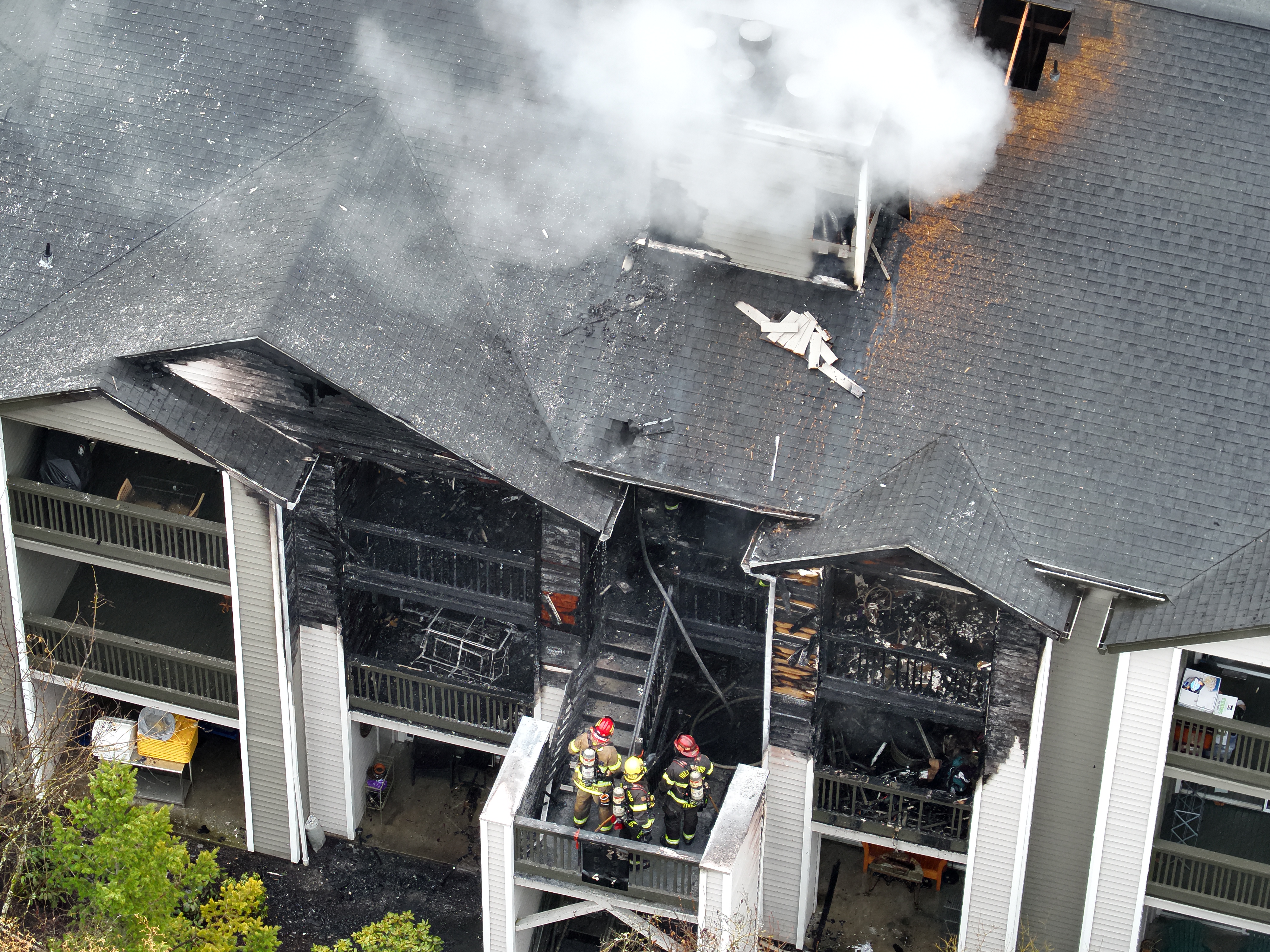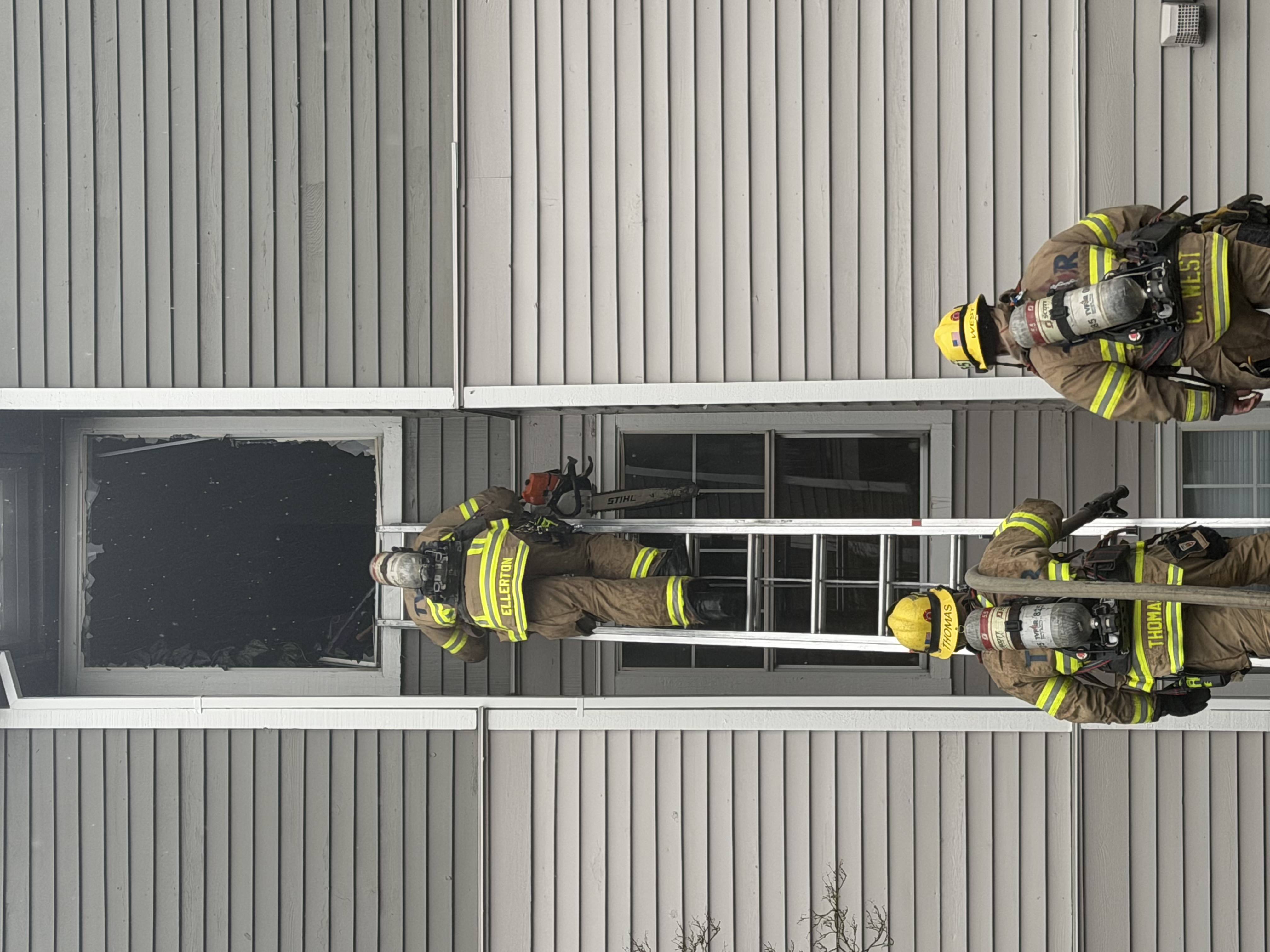 Given the volume of fire, the incident was upgraded to a second alarm at 8:17 a.m., bringing additional engines, trucks, and medical resources. Crews established a water supply, began attacking the fire from the inside, and searched throughout the affected floors for occupants. Firefighter contended with an unstable stairwell to the third floor and holes in portions of an upper‑floor deck due to the fire.