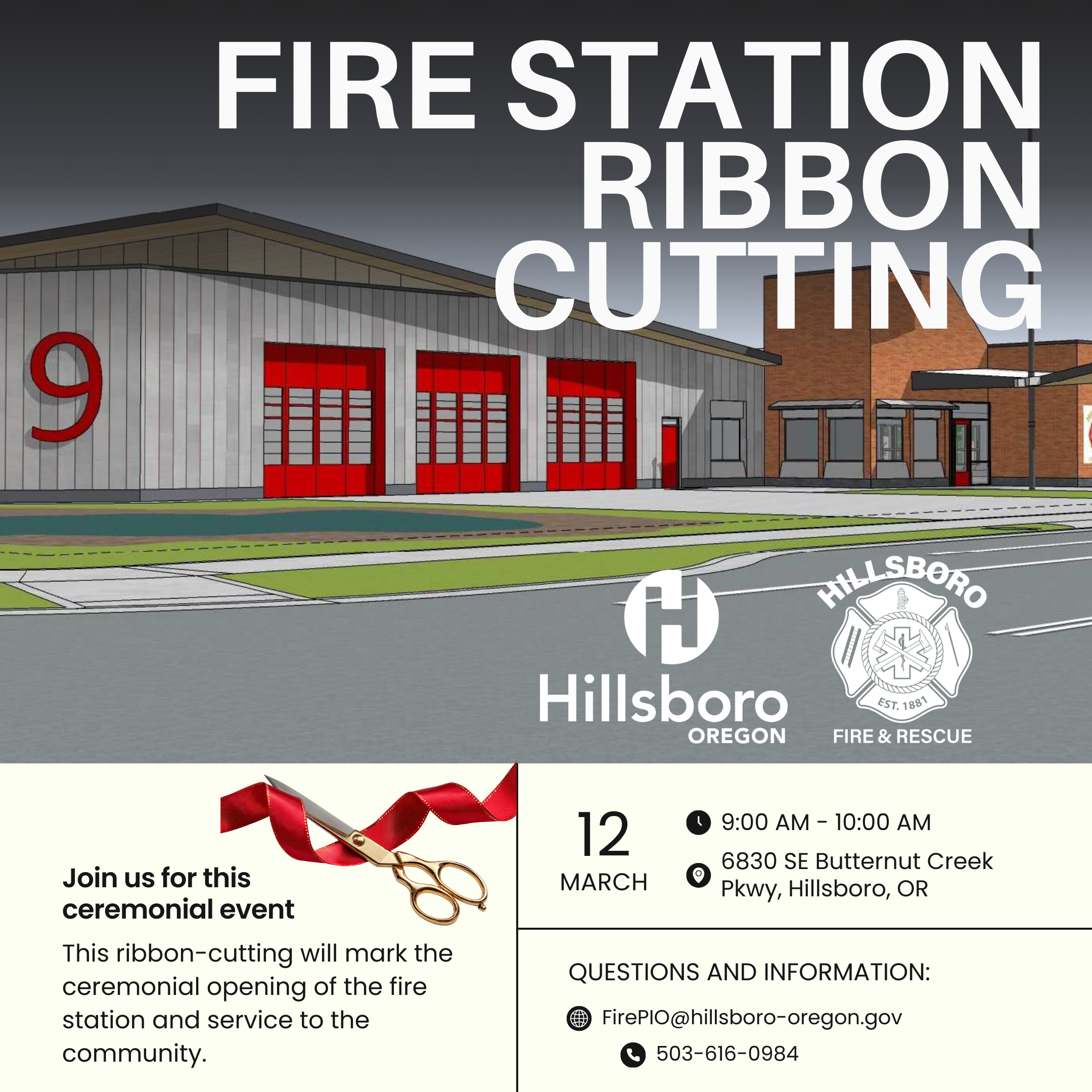 Members of the media are invited to attend the official ribbon-cutting and grand opening ceremony for South Hillsboro Station 9, the newest addition to the City of Hillsboro Fire & Rescue family. This milestone marks a significant investment in public safety infrastructure and expanded emergency response capabilities for the growing South Hillsboro community.