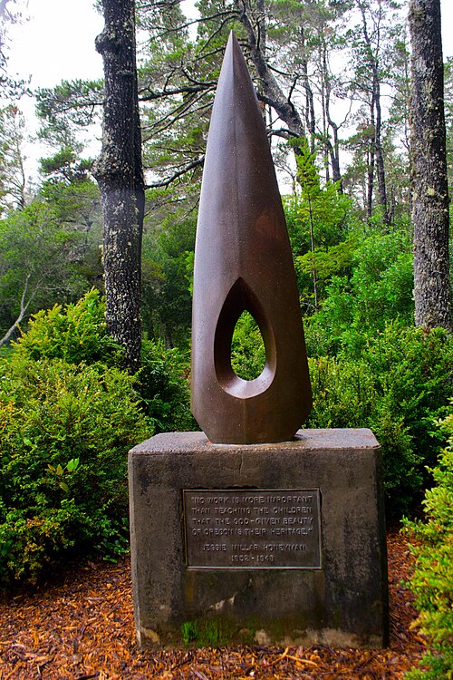 The bronze “Eye of the Needle” monument was dedicated to honor Jessie M. Honeyman in 1986, recognizing her tireless advocacy for Oregon’s natural resources and scenery along the state’s highways. The statue sculpted by Gordon Newell is a registered art piece with the Smithsonian.
